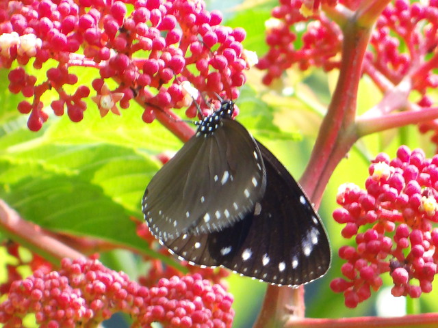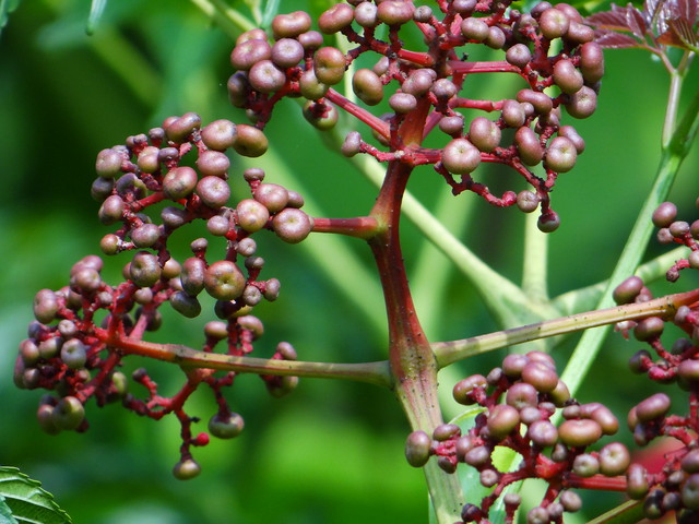 果: 果扁球形,直 0.6~0.8 公分,熟黑色。子 5~6 。花期 5~8 月,果期 7~12 月。果植物,果色由色暗墨色。