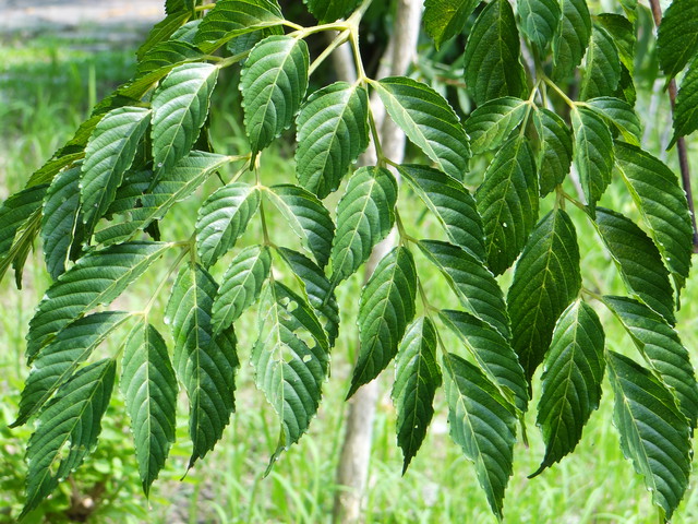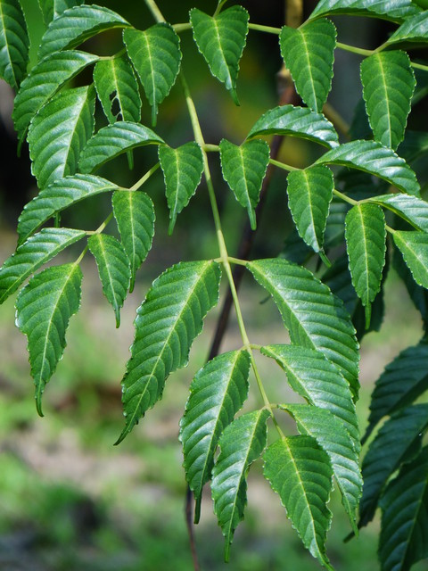 : 大互生,小生。羽奇。形有形、卵形。端尖,基楔形,,正反面都平滑,革。有 5~7 羽。色正面色,背面色。有 1 公分柄,有托。 6~15 公分, 3~8 公分。嫩色。