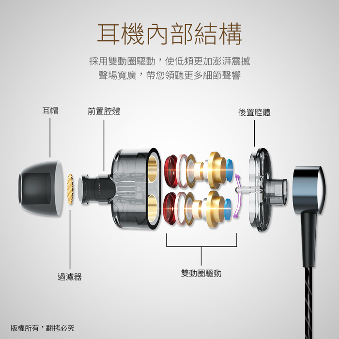 ◆圈大振膜,原完美HiFi音 ◆矽耳帽,配戴舒 ◆高中低三追求全面均衡,多次感