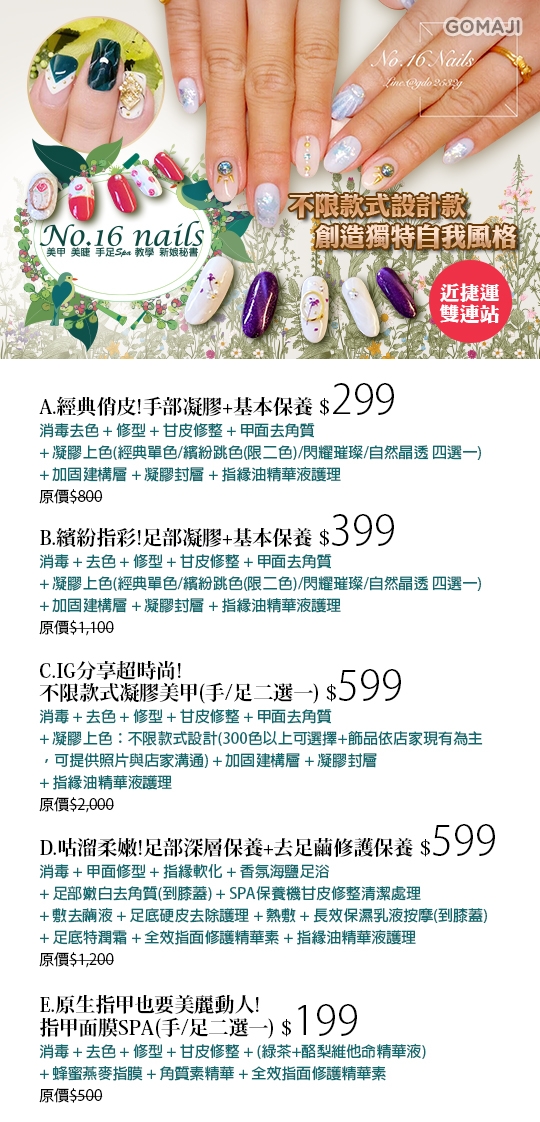 只要199元起,即可享有【No.16 Nails美甲美睫】A.典俏皮!手部凝+基本保 / B.指彩!足部凝+基本保 / C.IG分享超尚!不限款式凝美甲(手/足二一) / D.咕溜柔嫩!足部深保+去足修保 / E.原生指甲也要美人!指甲面膜SPA(手/足二一)↓↓↓限量特惠的惠按↓↓↓