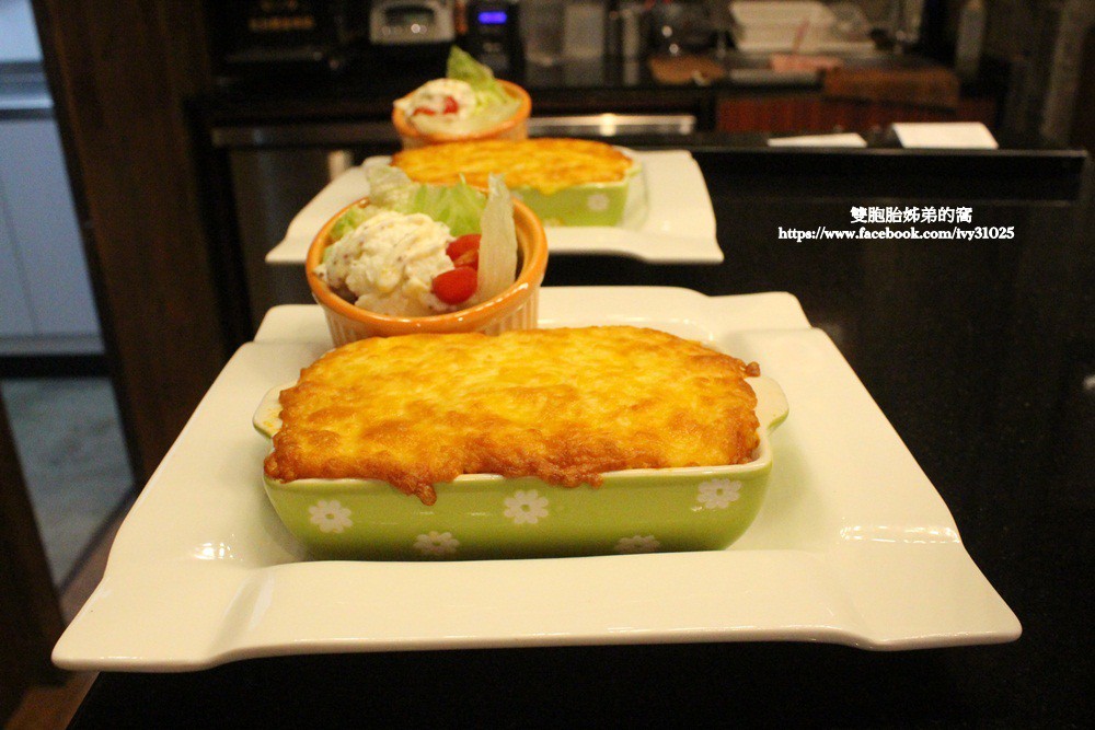 小碗的薯沙拉淋上好吃的沙拉,搭配一小片的蕃茄