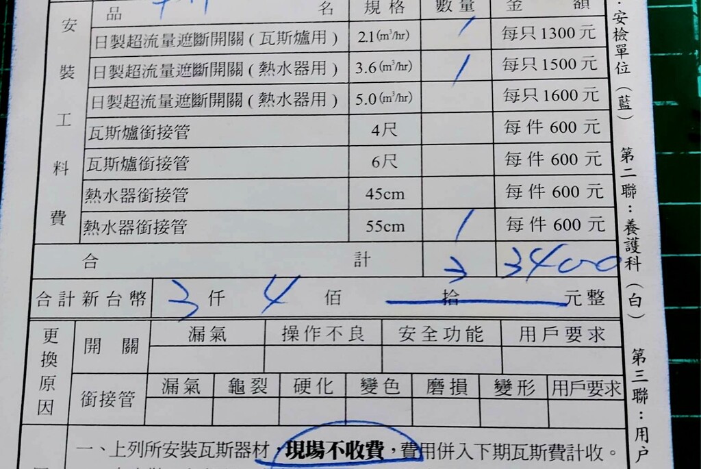 欣X瓦斯公司本大6~10用全部都更了瓦斯水器及瓦斯和接管,每NT:3,400元,我之所以同意更,主要是工作人能正出本社"主委"名字及住址...我想不是集吧?! 完~ 我查了新品出料,要他把品留下,俾免新品家,我是要自保.... , 之後我下的是全新的....如果新品拿到家去更,就根本法察出... 我提醒工作人,要先瓦斯,不然他就直接拆卸更了...