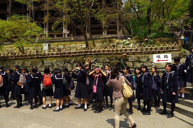 日本「清水の舞台からんだつもりで···」,「由清水舞台往下跳」,就是由此舞台出。 由下往上眺望,可使用12公尺以上巨大木列,且未使用一根子的造式工法建的。 你拍我之我拍你,正在修旅行中的女同朝我方向拍,背背色背包是老。其女生有趣的是清水寺山名「音羽山」因「音羽の」而得的三道泉! 站清水舞台再一,自不出「清水の舞台からんだつもりで···」者的心。官方站:http://www.kiyomizudera.or.jp/index.html