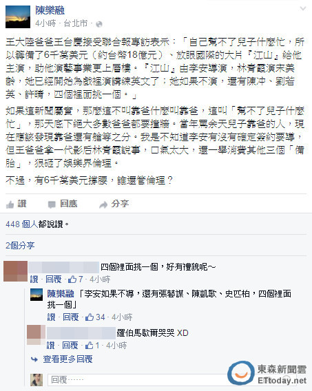 除此之外,融在PO文後,很多人也留言表意,有友跟著狠:「4(女演)面挑1,好有貌呢」,而他立刻跟著王爸爸照造句:「李安如果不,有、歌、史匹柏,四面挑一」,狂酸王大完全不嘴!