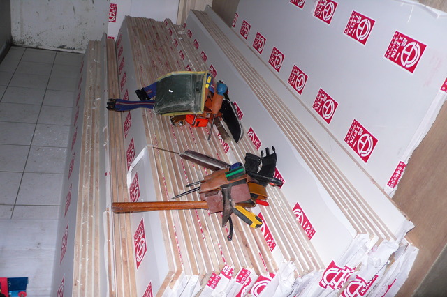 修好隔壁的破洞 拜天把堆在梯的管材料走