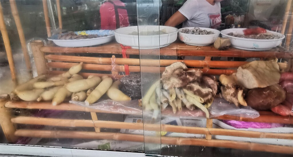 乾米血(1份/20元)及肉骨肉(1份/50元),乾米血上放上,米血吃起很Q,肉骨肉,吃起,肉很Q,沾上沾,味道更有富。