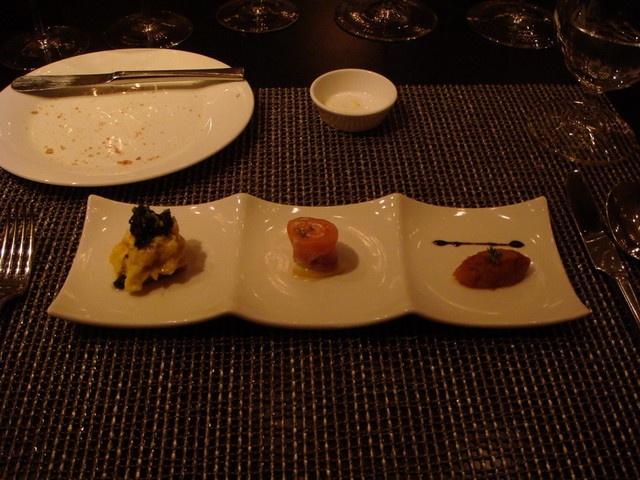 言侍者先端上送上包和Amuse-bouche供大伙解,Amuse-bouche是傅自解,左到右分是松露炒蛋、和拌薯火腿。很久吃到「炒蛋」了,次吃就遇到升版,加上松露和松露,好吃,下的包我就不了;有加上奶和香草(忘了名字),美好吃,很棒的搭配;拌薯火腿用了好的Jamon Iberico,傅是味道最重的料理,搭配得好,但我更希望做得再一些,搭酒更棒。