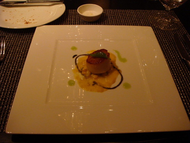 大家的前菜是,我不能吃,改以干作前菜,一大嫩煎干,火候控制得好,在足;人的子有玉米,我的干以玉米粒和汁作搭,果然好吃,玉米甜能托出干的甜呢!