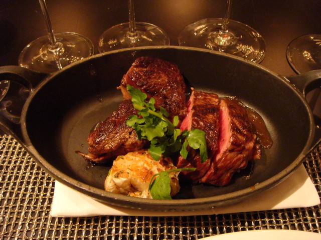主菜接著登,是傅手料理的美肋眼牛排8 oz,牛排肉使用板先煎、後入烤箱,傅也已事先熟成好,建以略血的medium rare最佳熟度,刀子是高的Laguiole。美牛肉果然好吃可口,油花均漂亮,而且口感嫩,搭配海、竹、岩、花四不同的,各有不同味,在非常享受。狸王也有出席餐,不吃牛的他改吃,餐也很地奉上排刀,看也是好吃得喝呢!