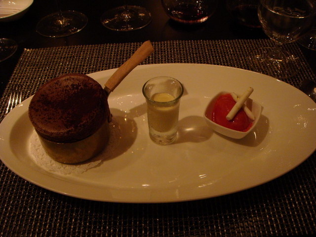甜在非常好吃、好吃非常,是已有年吃到的soufflé啊!巧克力口味的soufflé味道郁,搭配香草籽做的香草汁,汁淋入和巧克力soufflé融合著,香、口感都是,厚可保,在很美,也在好吃,想想自己有多久吃到的soufflé了,真心……享用soufflé之前,有覆盆子口味sorbet和白巧克力口,不在做得死甜了些。