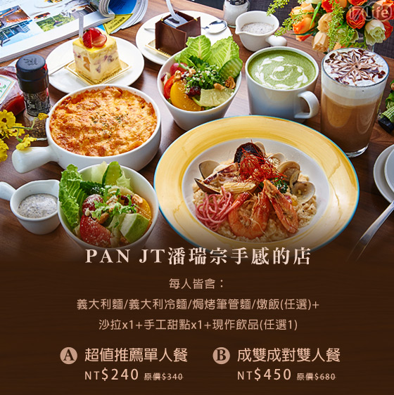 商品息述: 只要240元起即可享用【PAN JT潘瑞宗手感的店】原最高680元典套餐:(A)超值人餐/(B)成成人餐,皆含:大利/大利冷/烤管/(任)+沙拉+手工甜+作品。