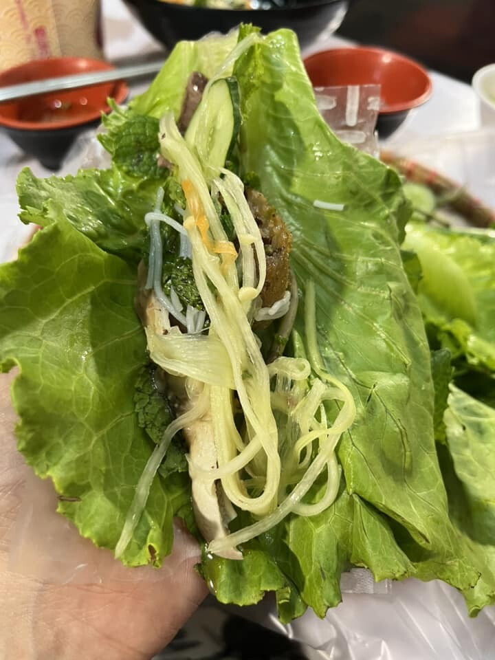 了他合的越南拼。首先你要把米放在手上然後再放上一片生菜,然後再把你想吃的西沾之後放在面起吃。我自己是得好吃的啦!我喜些香草的味道,面有一些血、很像黑白切的那好的可是理得不、有炸春跟肉。有一不知道是什西的食材。附的是薄荷我超喜的!了他的米特薄喔!