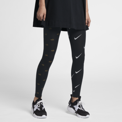 這款 Nike Sportswear 內搭褲結合經典品牌標誌圖案與現代金屬感元素,經典 Nike 標誌在兩邊褲管上閃耀生輝,右邊是 1971 年的原始設計,左邊是現在的 Swoosh 圖案。