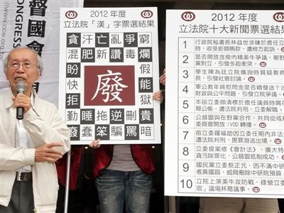 公民督盟今天表「2012年立法院年度字」,友出的字「」;民,公督盟不公正,格三道四。