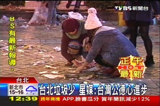 以往台北市跨年倒活束,都造多垃圾,但今年垃圾量少了,根台北市保局,今年垃圾量14.09公,和去年比起大幅少了3.41公,垃圾明少,台北民公德心步了,新加坡平面媒「海」也注意到了,度以「不是京」形容台北市的乾市容,但抽外客,有不同的感受。