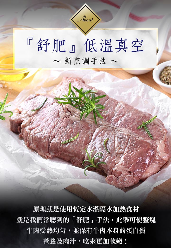 真空低舒肥法又低慢煮煮法,定度加,故能易的服硬部位,住牛肉的蛋白肉汁,食用的口感更加嫩多汁!