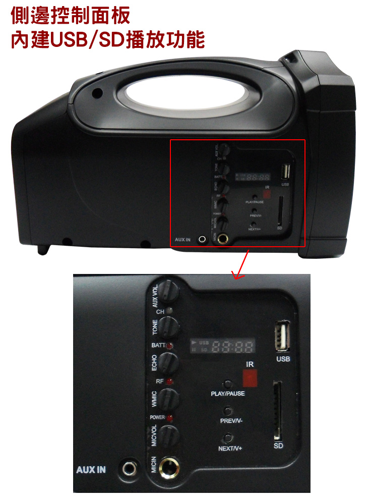置充式居家人池,待8小、建USB/SD播放功能、外控接收、具音及音功能、置源收空