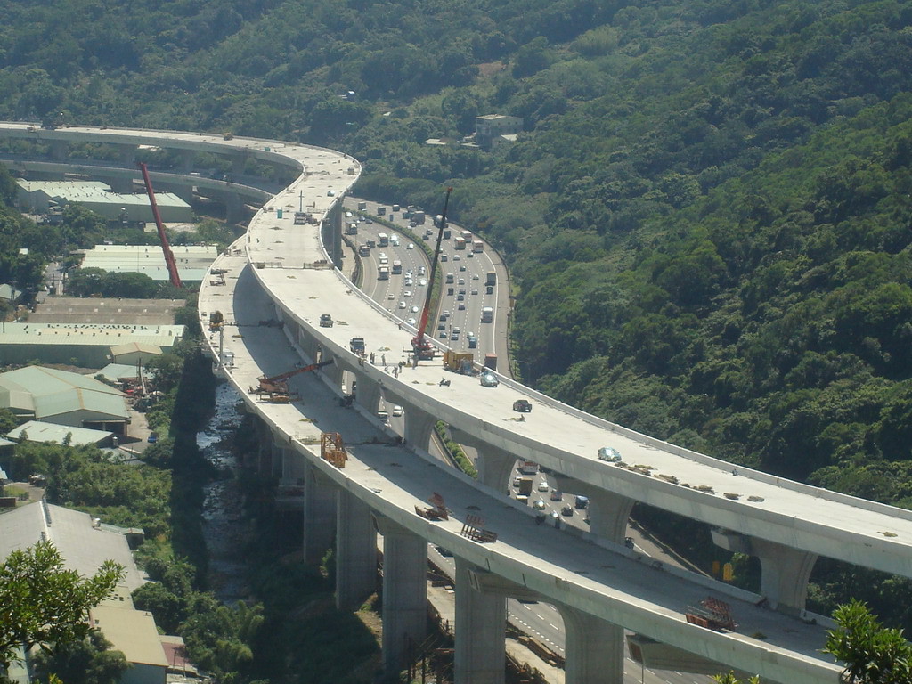 山谷底下是五高架的泰山到林口路段 , 梁已大致完工 , 正在施作工程 .