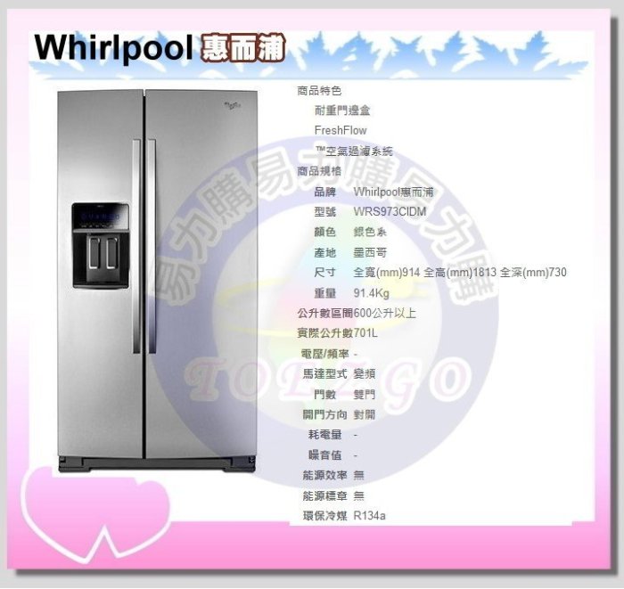 優寶購物《ubao.Tw》特貨品商城,黑貓宅配,取貨付款,福利品【Whirlpool 惠而浦原廠正品】對開冰箱 WRS973CIDM《701公升》全省安裝 | Yahoo拍賣