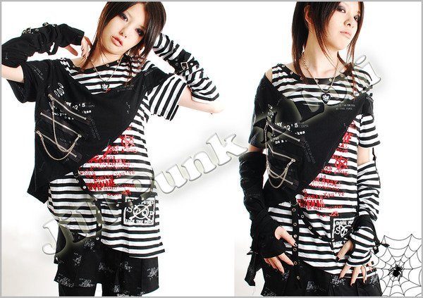 優寶購物《ubao.Tw》特貨品商城,黑貓宅配,取貨付款,Oo吉兒oO龐克帥氣中性搖滾~汪達爾野蠻人海軍條紋接袖袖套雞眼扣加工t恤 白【JGGA045W】 | Yahoo拍賣