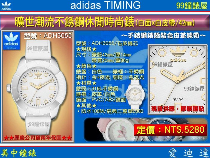 優寶購物《ubao.Tw》特貨品商城,黑貓宅配,取貨付款,【99鐘錶屋】adidas Timing愛迪達錶:《曠世潮流不銹鋼休閒時尚腕錶/白面白皮帶/42mm》(ADH3055) | Yahoo拍賣