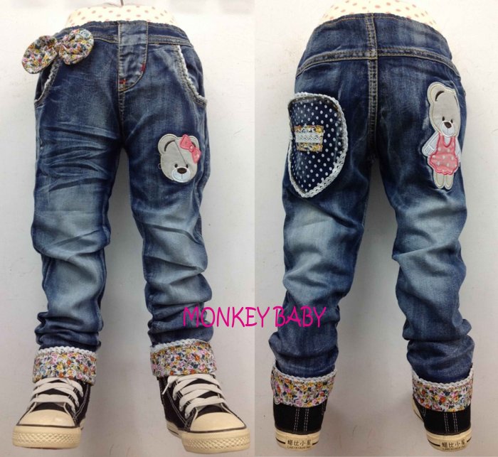 優寶購物《ubao.Tw》特貨品商城,黑貓宅配,取貨付款,全館滿699免運【MONKEY BABY 】小碎花蝴蝶結反摺熊熊圖案女生牛仔長褲 | Yahoo拍賣