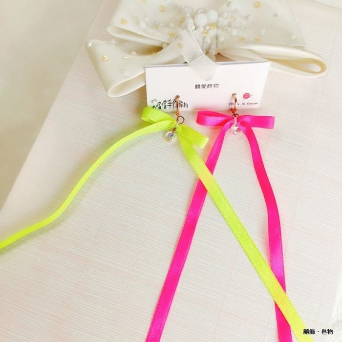 優寶購物《ubao.Tw》特貨品商城,黑貓宅配,取貨付款,[囍飾.原創設計]手工緞帶系列-青春少女雙主色螢光蝴蝶結長緞帶啵~亮~施華洛世奇亮彩水晶耳勾/耳夾/耳環 | Yahoo拍賣
