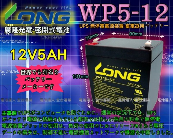 優寶購物《ubao.Tw》特貨品商城,黑貓宅配,取貨付款,【電池達人】不斷電 UPS 廣隆電池 WP5-12 LONG 科風 飛瑞 台達 湯淺 NPH5-12 HR1221W | Yahoo拍賣