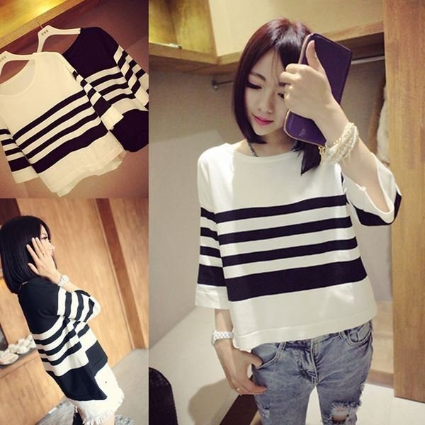 優寶購物《ubao.Tw》特貨品商城,黑貓宅配,取貨付款,秋新款女裝七分袖圓領寬鬆顯瘦黑白條紋撞色百搭七分袖針織衫上衣 | Yahoo拍賣