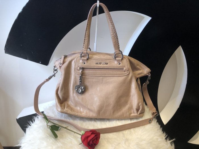 優寶購物《ubao.Tw》特貨品商城,黑貓宅配,取貨付款,※芯閣名牌精品店※ MIU MIU 卡其色 復古牛皮 愛心 水鑽吊飾 手提/肩背兩用包 8成新 | Yahoo拍賣