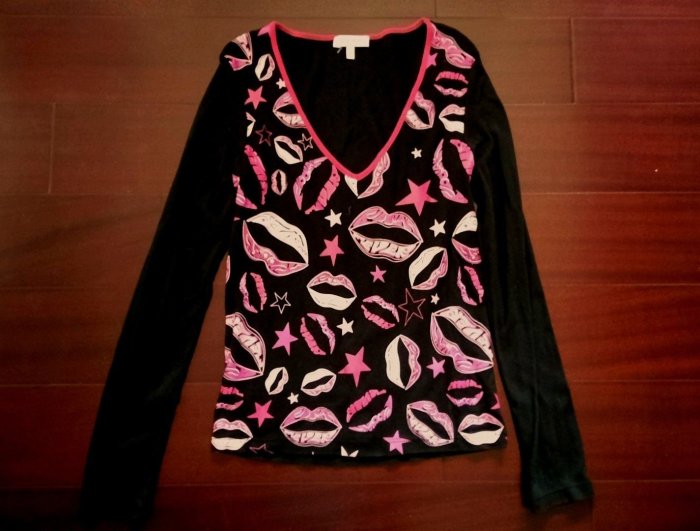 優寶購物《ubao.Tw》特貨品商城,黑貓宅配,取貨付款,(搬家大出清)法國品牌 KOOKAI 黑底桃/粉紅/白色混搭 ? ?圖騰長袖 T 恤衫。V領有彈性。 尺寸 法國 2碼 | Yahoo拍賣