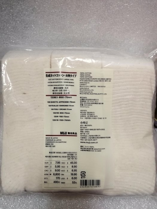優寶購物《ubao.Tw》特貨品商城,黑貓宅配,取貨付款,MUJI 無印良品 原色化妝棉 (棉100%) 135入 (夾袋) 90×70mm 大判 大片 有機高品質導油棉 | Yahoo拍賣