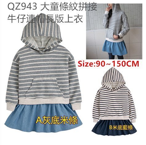 優寶購物《ubao.Tw》特貨品商城,黑貓宅配,取貨付款,**阿布童裝**【QZ9438】超美~女大童條紋拼接牛仔連帽長版上衣帽T裙衣 連身裙小洋裝 90~150CM | Yahoo拍賣
