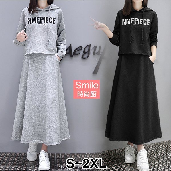 優寶購物《ubao.Tw》特貨品商城,黑貓宅配,取貨付款,【V3068】SMILE-悠閒單品.字母印花連帽上衣長裙兩件套裝 | Yahoo拍賣