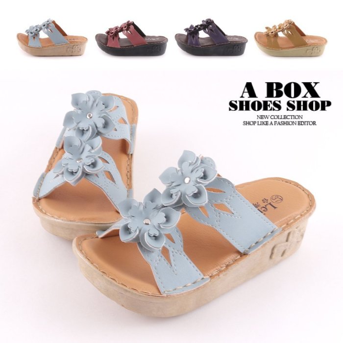 優寶購物《ubao.Tw》特貨品商城,黑貓宅配,取貨付款,格子舖*【AN205】舒適乳膠鞋墊 前3後5CM涼鞋 休閒百搭立體花朵 皮革楔型厚底圓頭涼拖鞋 MIT台灣製 4色 | Yahoo拍賣