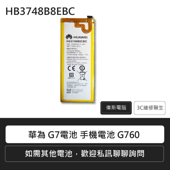 優寶購物《ubao.Tw》特貨品商城,黑貓宅配,取貨付款,☆偉斯科技☆華為HUAWEI G7 / G760 手機電池 鋰電池 電池更換 手機維修 HB3748B8EBC附發票 | Yahoo拍賣