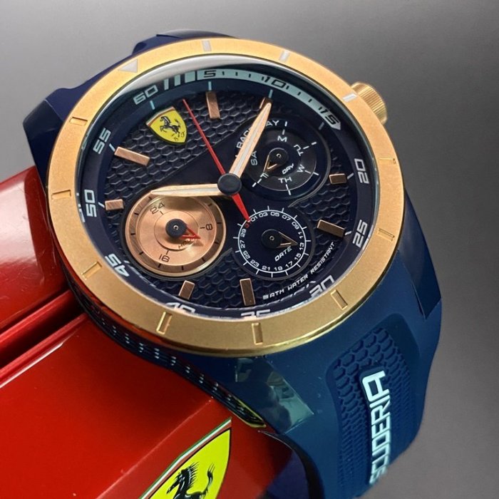 優寶購物《ubao.Tw》特貨品商城,黑貓宅配,取貨付款,FERRARI法拉利男錶,編號FE00011,44mm玫瑰金, 寶藍圓形精鋼錶殼,寶藍色三眼錶面,寶藍矽膠錶帶款 | Yahoo拍賣