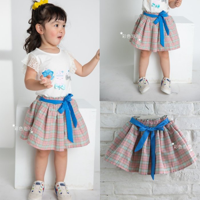 優寶購物《ubao.Tw》特貨品商城,黑貓宅配,取貨付款,○。° 彩色泡泡 °。○ 童裝【貨號Q7599】春夏。藍腰帶粉格紋大圓裙 | Yahoo拍賣