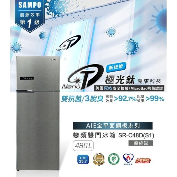 優寶購物《ubao.Tw》特貨品商城,黑貓宅配,取貨付款,聲寶SAMPO 480公升 1級 變頻 雙門冰箱 SR-C48D AIE智慧節能 外顯式觸控面板 | Yahoo拍賣