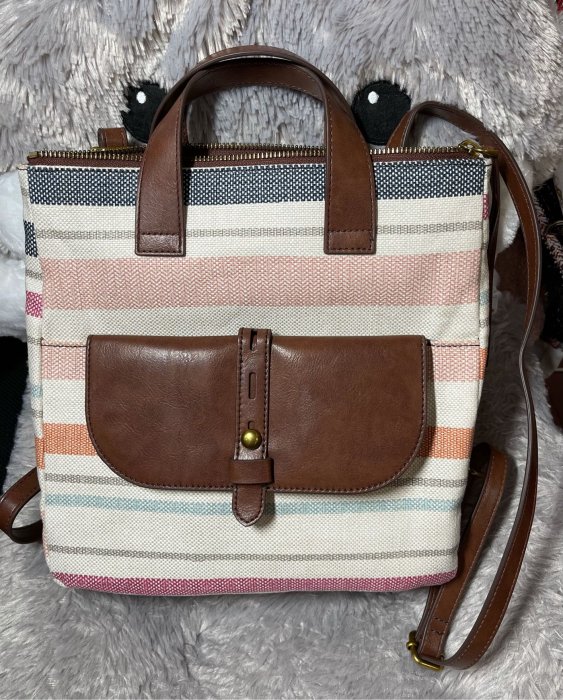 優寶購物《ubao.Tw》特貨品商城,黑貓宅配,取貨付款,Fossil 限量版 帆布 織布 彩虹 彩色 條紋 牛皮 前口袋 雙用 手提 拖特 紙袋包 後背包 公事包rx* | Yahoo拍賣
