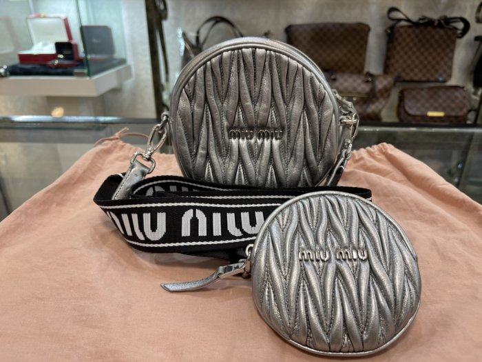 優寶購物《ubao.Tw》特貨品商城,黑貓宅配,取貨付款,女人街國際精品*MIU MIU經典款 銀色 二合一 字母logo寬背 肩帶 圓餅包 | Yahoo拍賣