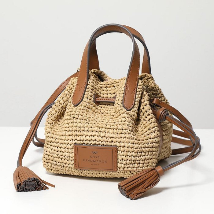 優寶購物《ubao.Tw》特貨品商城,黑貓宅配,取貨付款,【折扣預購】24春夏正品ANYA HINDMARCH 焦糖色皮革流蘇 米色草編包 抽繩束口肩背包 手提包 | Yahoo拍賣