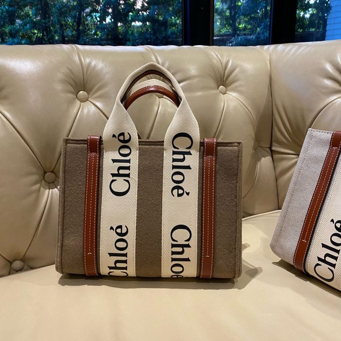 優寶購物《ubao.Tw》特貨品商城,黑貓宅配,取貨付款,【翰貝格名牌館】全新真品 Chloé 字母 Woody Tote 羊毛氈 拼 小牛皮 小型 淺棕色 揹帶款 托特包 預購 | Yahoo拍賣