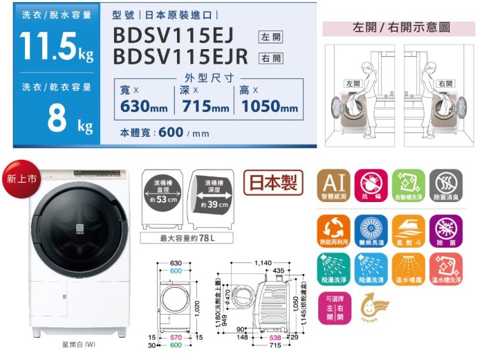 優寶購物《ubao.Tw》特貨品商城,黑貓宅配,取貨付款,送安裝~日本製!《586家電館》HITACHI日立 滾筒式洗脫烘洗衣機 【BDSV115EJ】左開 | Yahoo拍賣
