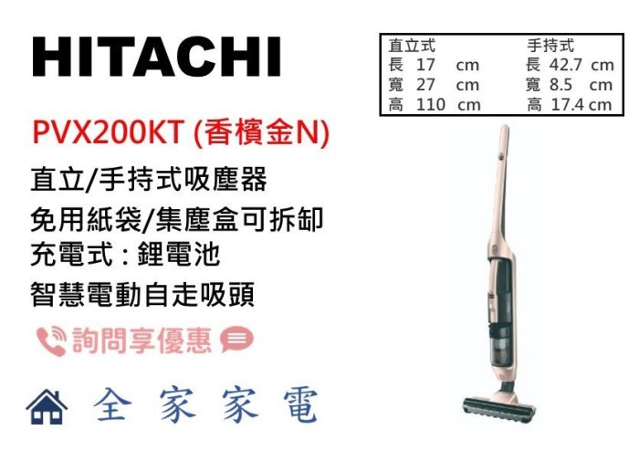 優寶購物《ubao.Tw》特貨品商城,黑貓宅配,取貨付款,【全家家電】日立 直立吸塵器 PVX200KT(N香檳金) 免用紙袋 另售 PVXL1KT 典雅白 【詢問享優惠】 | Yahoo拍賣