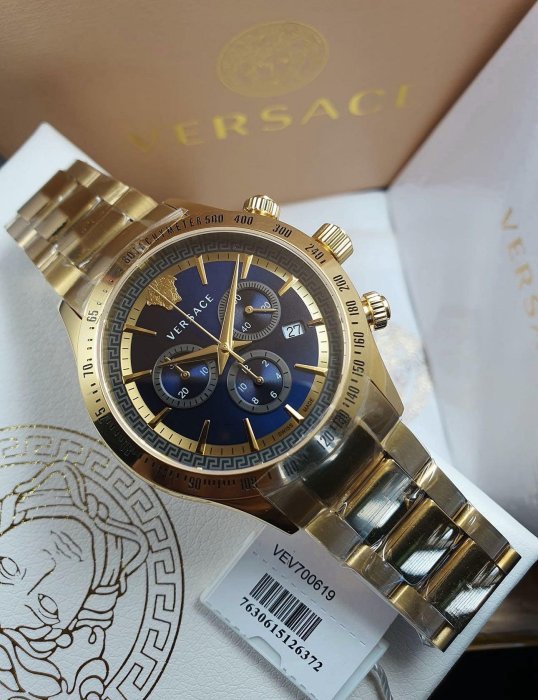 優寶購物《ubao.Tw》特貨品商城,黑貓宅配,取貨付款,VERSACE Chrono Classic 藍色面錶盤 金色鋼錶帶 石英 三眼計時 男士手錶 VEV700619 | Yahoo拍賣
