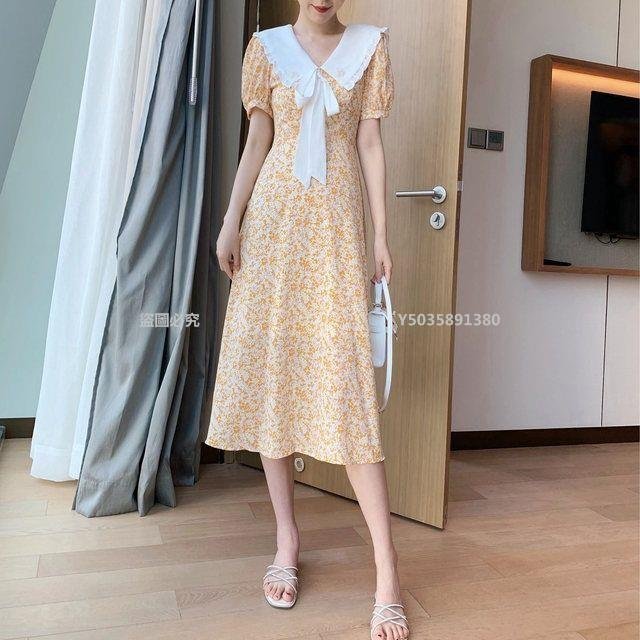 優寶購物《ubao.Tw》特貨品商城,黑貓宅配,取貨付款,【熱賣精選】甜美娃娃領黃色碎花連衣裙女夏蝴蝶結收腰顯瘦泡泡袖茶歇初戀長裙 | Yahoo拍賣