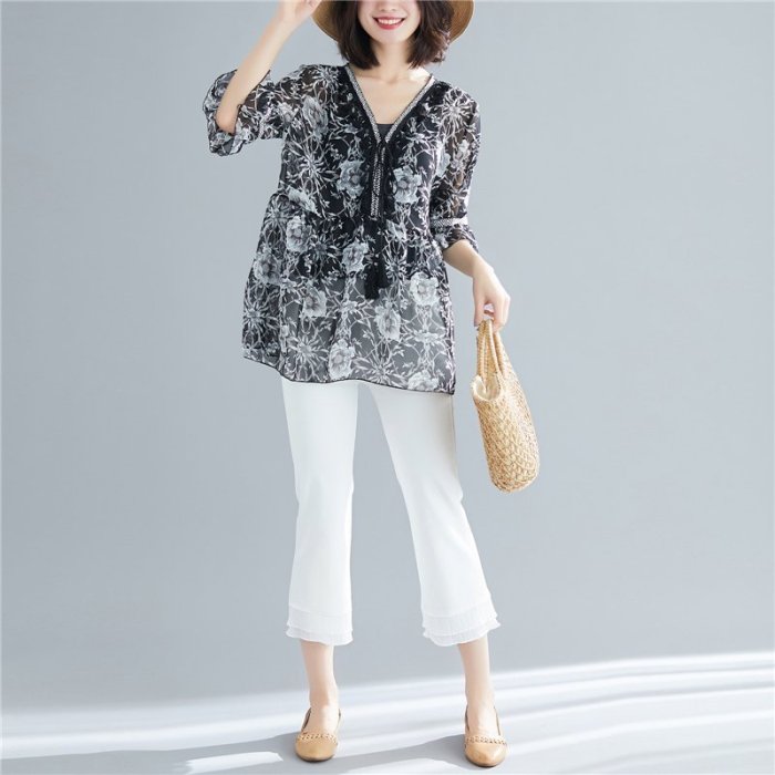 優寶購物《ubao.Tw》特貨品商城,黑貓宅配,取貨付款,下殺 大尺碼上衣 大碼女裝熱銷2019夏季新款新碎花雪紡衫寬松V領流蘇上衣洋氣顯瘦襯衫潮 洋裝TY036 | Yahoo拍賣