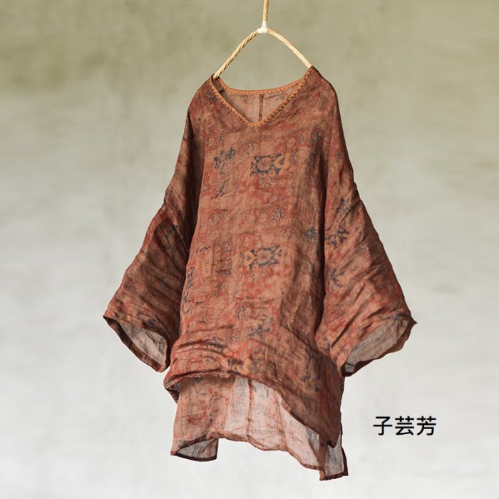優寶購物《ubao.Tw》特貨品商城,黑貓宅配,取貨付款,【子芸芳】數碼印花苧麻輕薄大碼復古文藝寬鬆手縫線V領七分袖上衣 | Yahoo拍賣