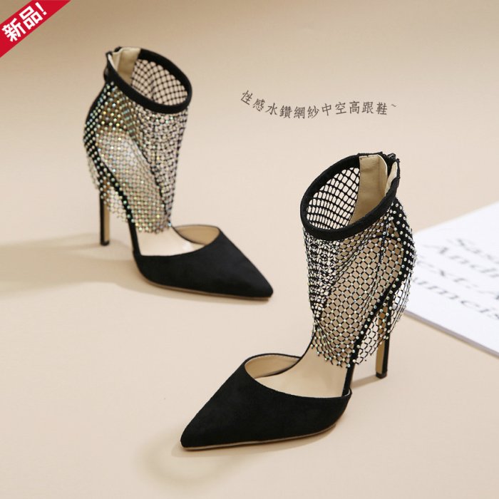 優寶購物《ubao.Tw》特貨品商城,黑貓宅配,取貨付款,EFP大美人-2023新品♥性感網美舞台夜店水鑽洞洞網布中空綁帶12CM絨面尖頭高跟鞋~黑色大尺碼35-42 | Yahoo拍賣